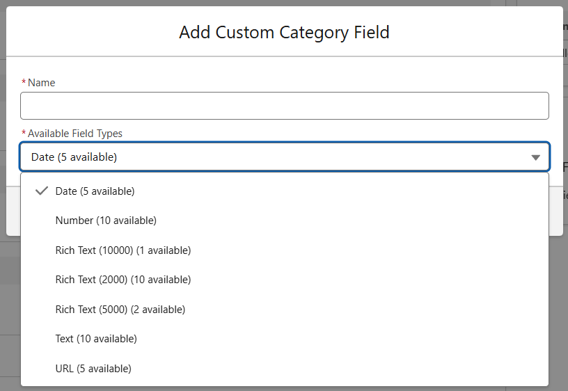 Categories can also support Custom Fields when required for your data structure. To add a new field to a Category, open the drop down menu on the right hand side of Custom Category Fields and select “New”.