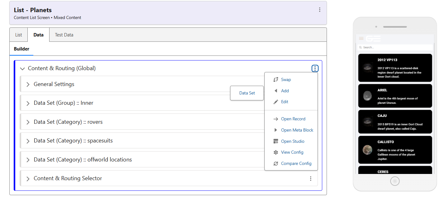 Data can be added to List Screens as either categories or groups. To add a new data set, open the menu of Content & Routing. Here, you can add a ‘Data Set’, created as a Category by default.