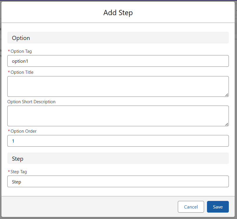After adding two steps from the Start page, the guided flow looks like the following screenshot. The Option Tag & Title refer to the Blue signpost box, while the Step Tag refers to the Tag attached to the flow. The order can be configured as required.