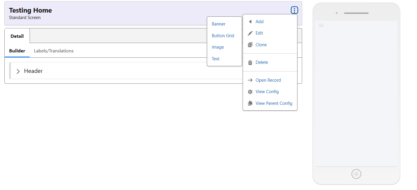 A new screen will always be blank, and often a Banner will be the first thing added. For this demo, we can add a Banner and style it to start building it out the page. Use the Screen Menu to add the Banner.