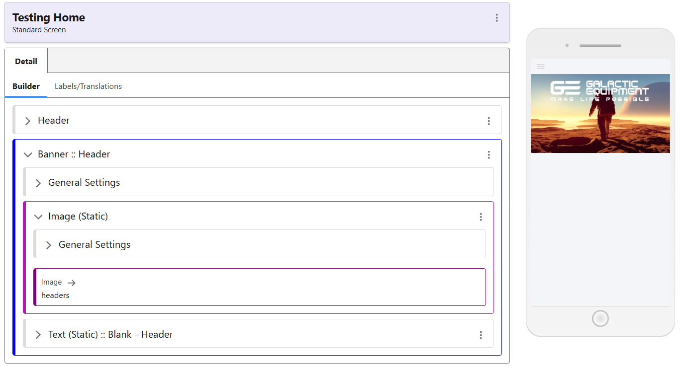 Once your Banner has been created, click the ‘Add Image’ button in its menu. From here, you can select from already uploaded images, or use the ‘Upload Media’ tab to do so on the fly. Pick an image, and if you are not using text, just edit and save the Text (Static) without changing anything. Finally, edit the top level Banner component, choose a name, and select the styling option most suitable to your needs. You can edit its properties afterwards if necessary – or create your own. Now your page should look like this: