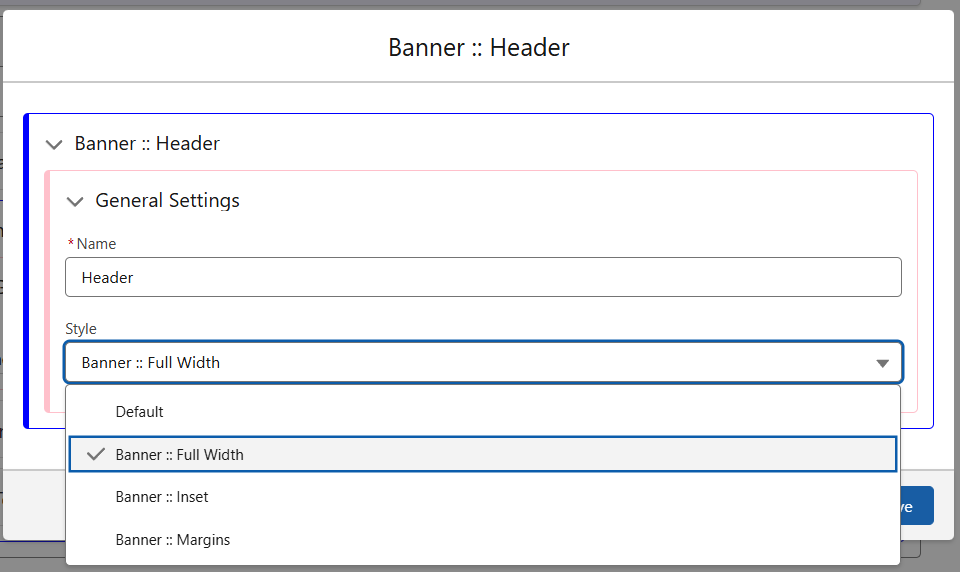 Available as default classes for Banner styling are those seen below. For the above Header, we are using the Full Width class, although margins and inset are also available.