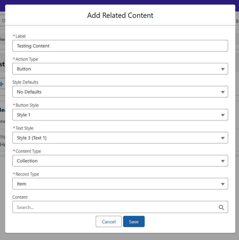 Other pieces of Content can also be linked to directly from within articles, the ‘Add Related Content’ option gives you this screen. It can be styled as a button or as a direct link.