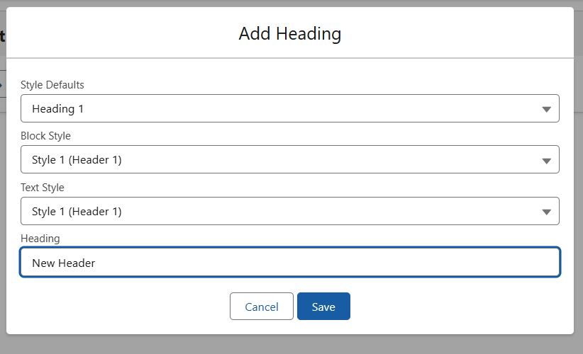 With our configured Style Guide, adding a new Heading should give the default options for styling. In this way, building article pages can be very fast. As you can see, there is both a Block and a Text Style here, controlling the content itself and how it is contained.