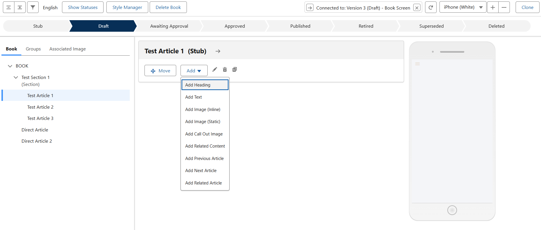 Each article, when created, will be blank, as seen below. The Add Menu can put any of the displayed elements onto an article. Before any Book can be published, every article must have at least one element included on it. Elements such as Text or Images are contained within a Block, which has its own styling properties