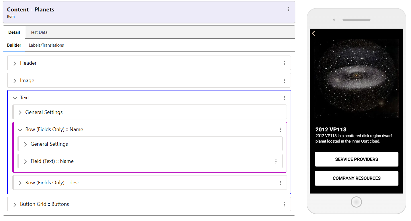An example of a configured screen is the following screenshot. Taken from our Demo app, it uses the associated image of the Collection Item, as well as pulling through its Name & Description. The Button Grid links to relevant pieces of data connected to this record, such as the Service Providers which cover this galactic region, and the Company Resources available for Mining in this location.