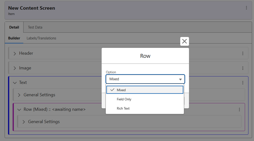 As seen below, a Mixed Row can contain any of the following types. Once the Text has been added, it can be swapped to the options seen here.