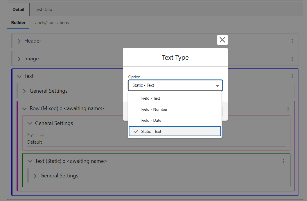Similarly to adding an image, it is possible to use static information, or to pull through from the record. Use the ‘Add’ menu to select Text. By default it will be created as ‘Mixed’.
