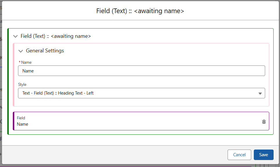 If swapped to Field Only, then when selecting the field you have the following options – Name, Style, and Field. Input each as required and hit Save.
