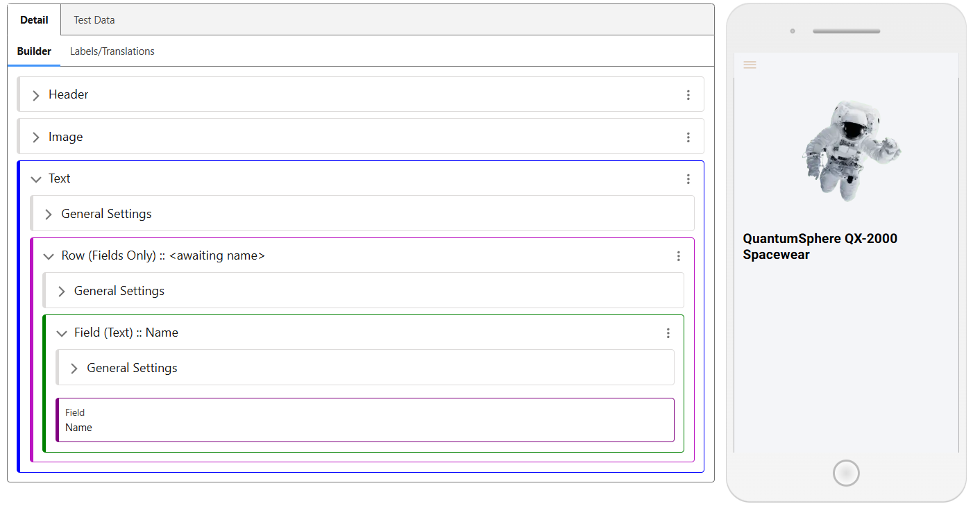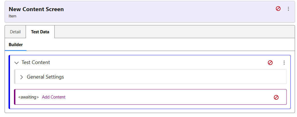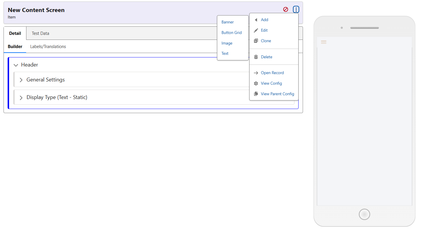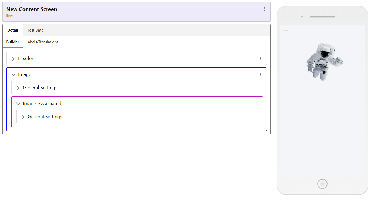 The Test Data allows the screen to be worked on while visualising the changes made by using a Collection Item as a reference. If the Name or Description is added to the Screen, the data displayed will be from the Test Content selected.