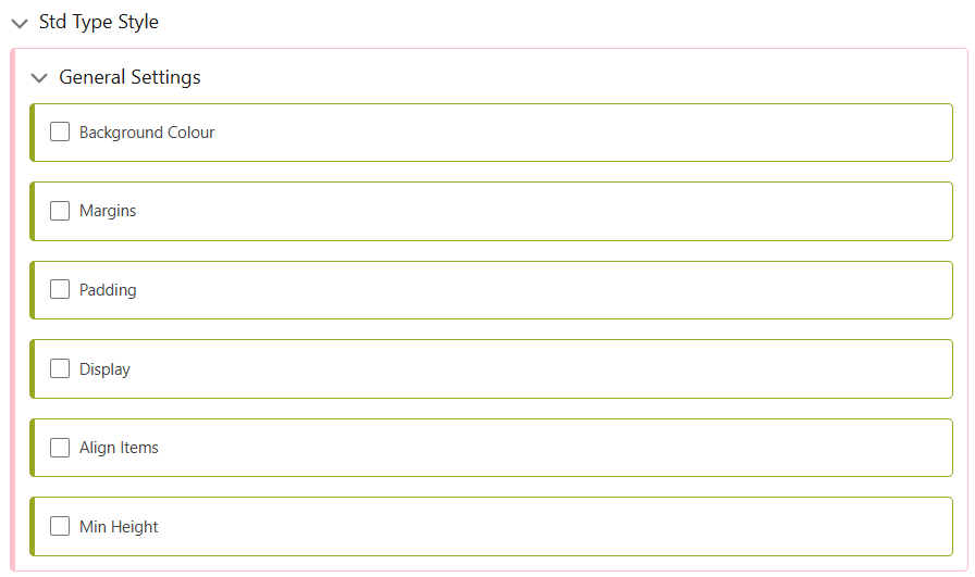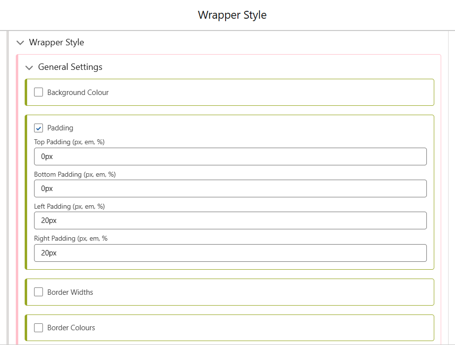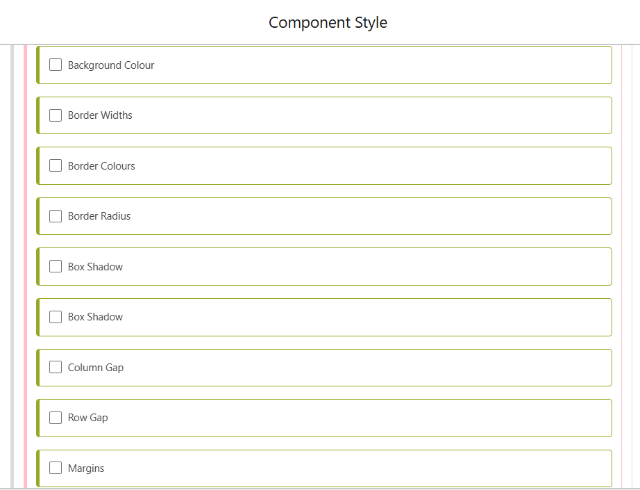 The General Settings style component controls the Component itself, NOT the items in the list. Seen below, the Wrapper Style provides Padding around the List Component.