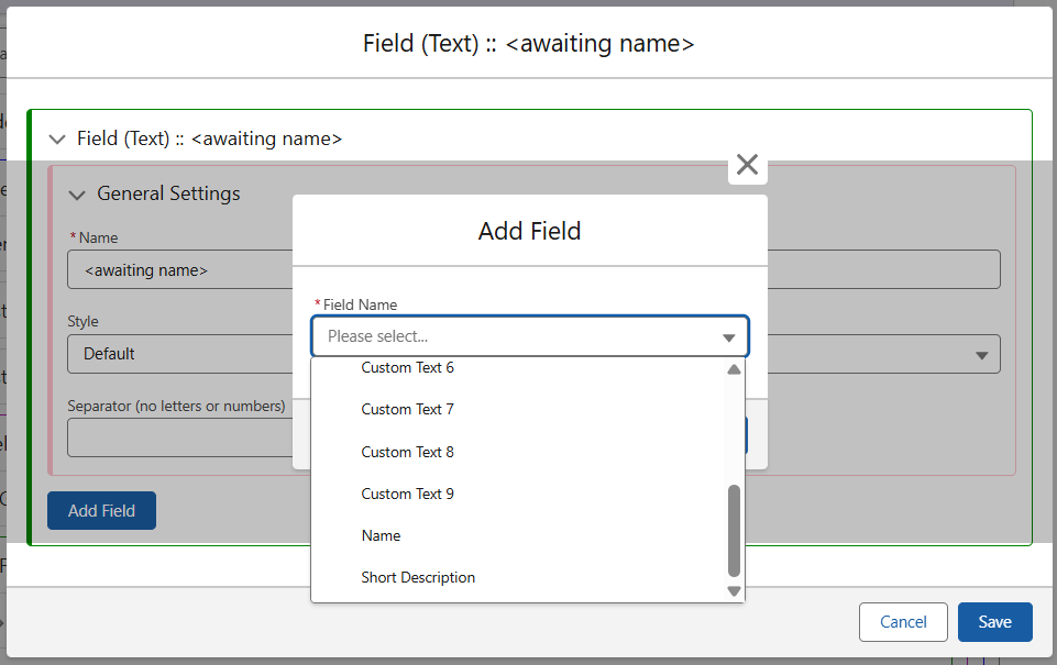 When selecting the field, you can select any of the Custom or Standard fields, as well as providing a Text Style. When configuring this screen, select the required field and either create or give it a style. For a guide to styling Text, click here.