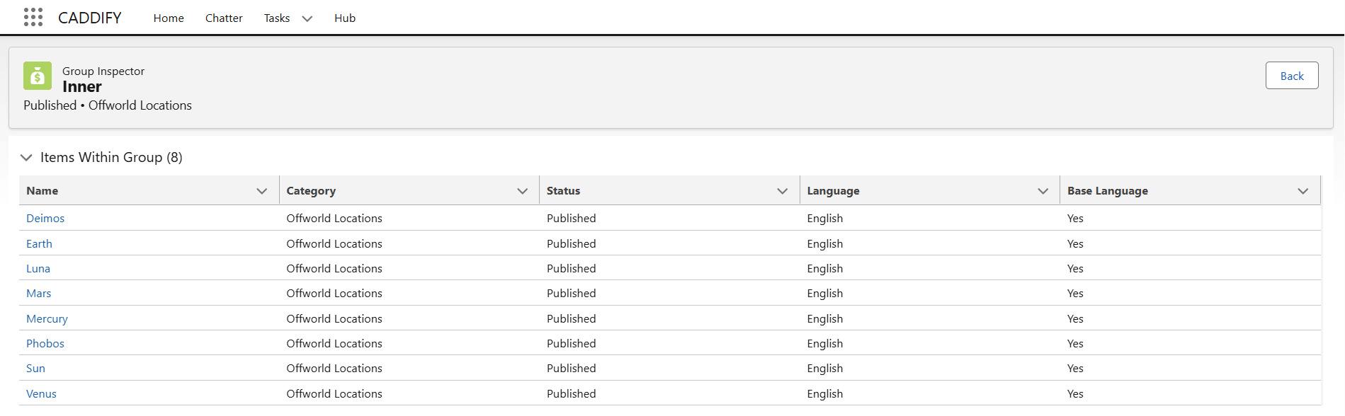 Once your groups and categories become populated by data, it can be difficult to see the relationships. For this, there are several tools within Caddify to visualise your data. At the top of each Group record, there is the ‘Group Inspector’ button, which will show you the following screen as relates to your Group: