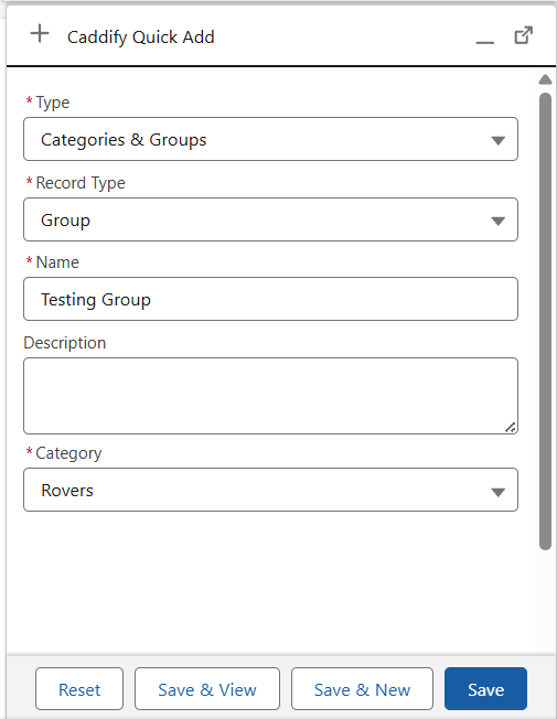 To create a Group, use the Quick Add Menu, and select the Category to which this group belongs.