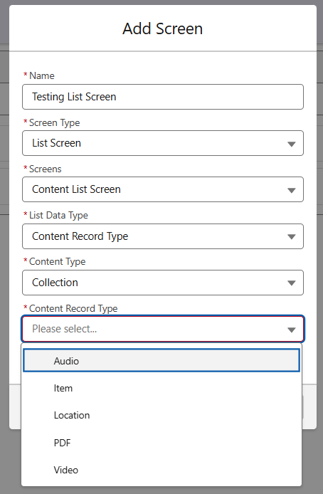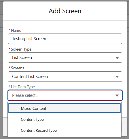 The next choice to make is the Content Type. Mixed Content allows for a List Screen to display various types of content collected in one list, this may be all data related to a certain product; such as a Book, Videos, and Collections relating to its functionality.