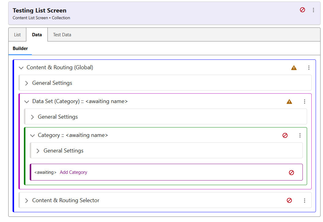First, you should go to the ‘Data’ tab, and use the ‘Add Category’ button you can see below to choose a category that will be used for this screen. Once this has been selected and saved, then open the ‘Test Data’ tab, and choose this Category as the test data. There will only be one option available for now under the Test Data.