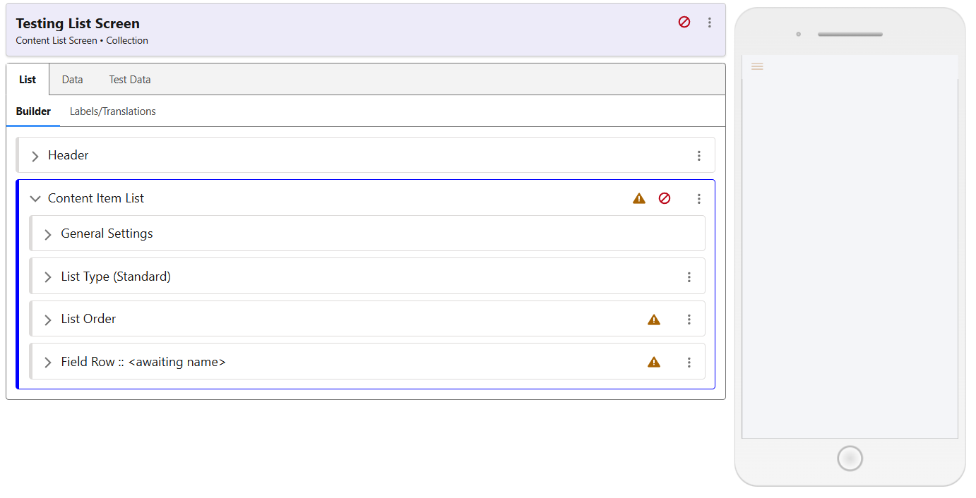 When creating a new List Screen, first a decision must be made on using a List or Listing Screen. A List Screen allows for further navigation, in which selecting a List item will transition to another screen and surface more information. A Listing Screen is a terminus screen, which shows the items and required information with no navigation possible.