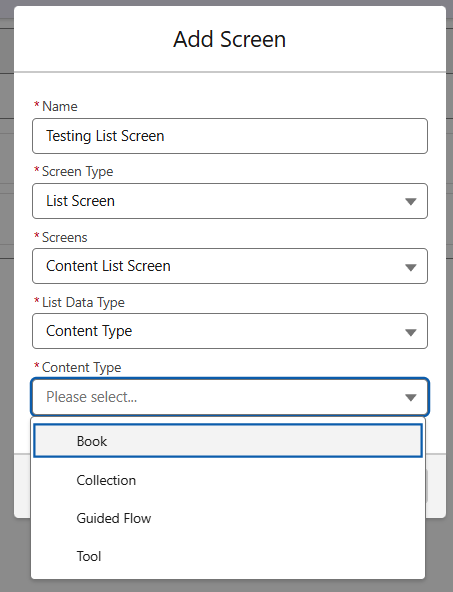 Content Type is a more refined list, supporting a specific type of Data. As seen below, this can be Books, Collections, Guided Flows, or Tools.