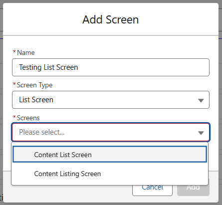 Once added, use the Add Content Screen button to select which screen list items will direct to.