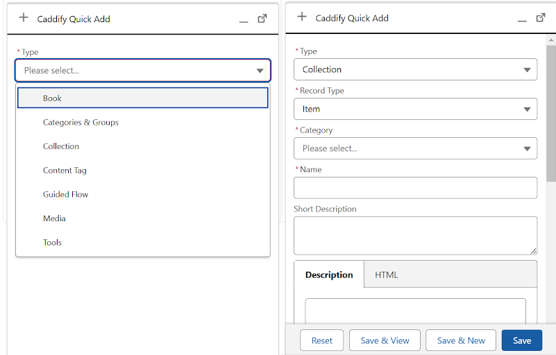 The Quick Add Menu, accessible from anywhere in Caddify from the bottom left of your screen, is an easy way to add any piece of data to the system. From here, any of the options that you see in the drop down menu below can be added. You can create records one after another, as selecting Save & New will save the last Category and Group selection made, or view your record and Publish it immediately. When you select which type of record you want to create, the following screen will look like the second screenshot below. For large data sets, it is often necessary to create it in bulk, the guide is here.