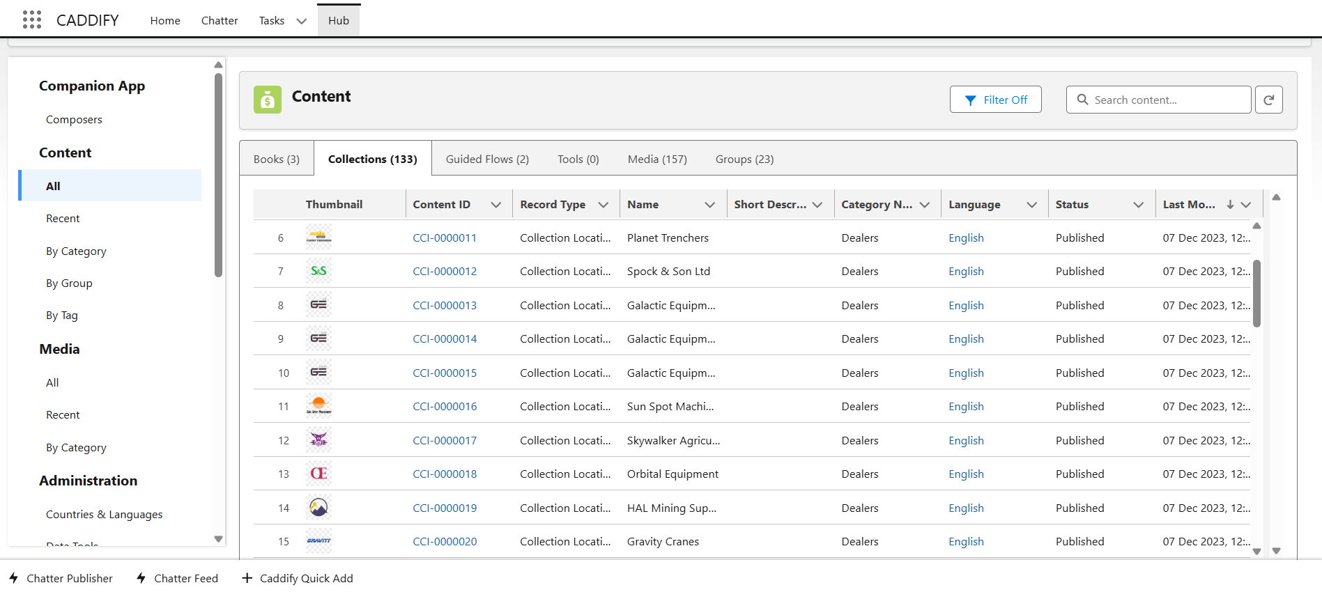 In the Content section of the Hub are all of the Collections, Books, Tools, Media Assets, and Categories & Groups used to create your data architecture. As seen below, each data type has its own section, but can be explored By Category/Group/Tag by selecting the relevant filter from the left hand side menu. This section, Data Types, details the creation and functionality of these data types, while its sister section explores the Content Management aspect; Categories, Groups, and Content Tags.