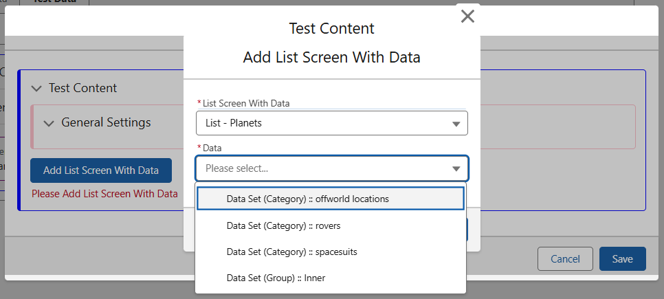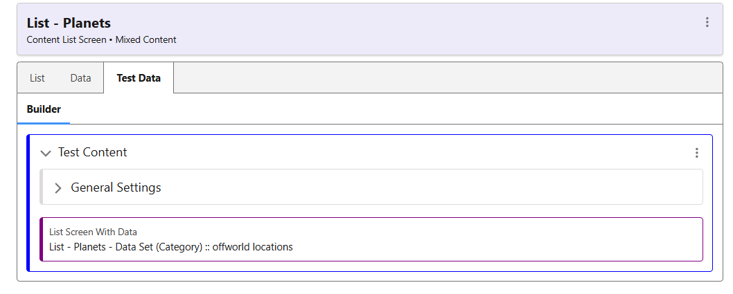 Navigate to the “Test Data” tab on your list screen and open the Test Content drop down. A new screen will have nothing added here, and will therefore not display any styling changes made.