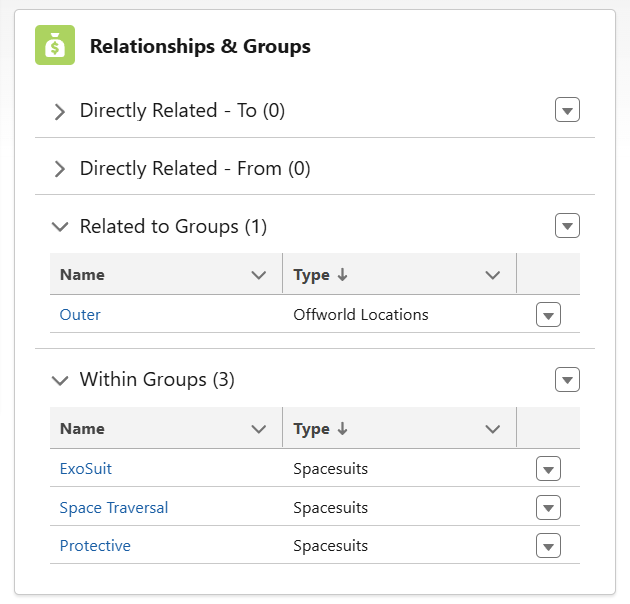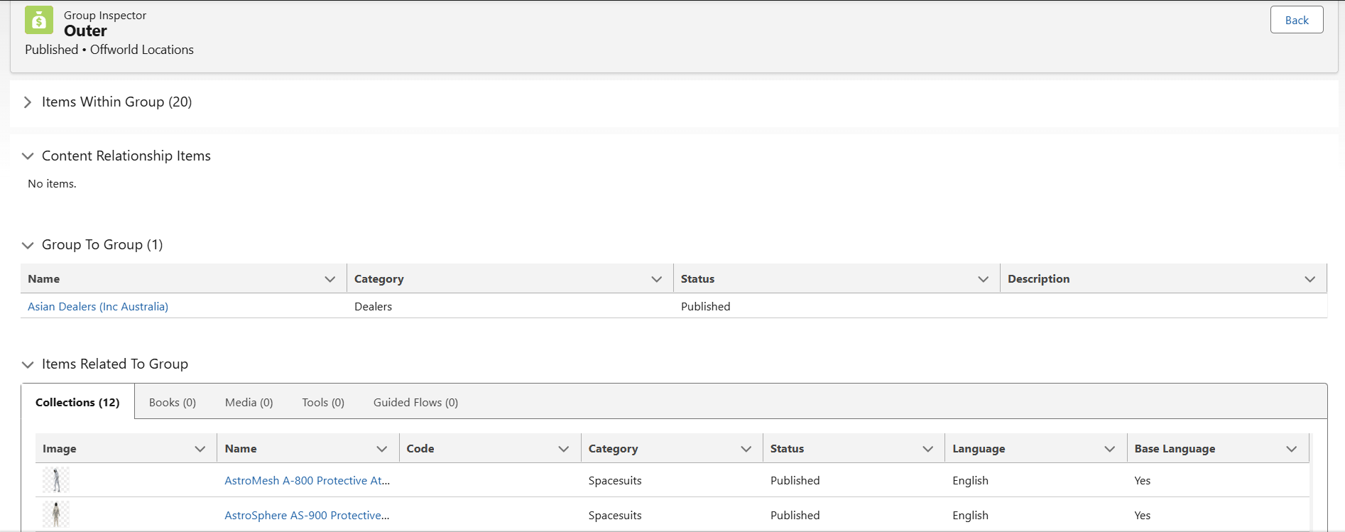 Using the Group Inspector on the ‘Outer’ Category reveals a larger part of this picture. Here, you can see that there are 20 items directly within the Group of Outer. The group is directly related to the group containing various dealerships, and 12 collection records (in this case Spacesuits) are related to this group, allowing for data manipulation within the app screens.