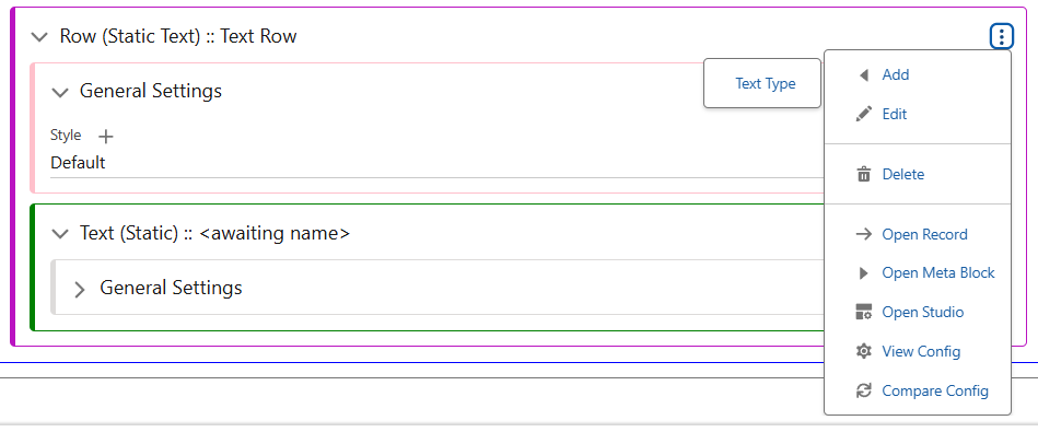 Text Rows are the next level of organisation. Depending on which screen type this text is in, there will be different options for the types of Text available to add to Rows. In screens which display pieces of data, such as Lists/Content Screens, fields can be directly displayed as text. By using the Add menu of the Text Row, you can add as many pieces of text as possible.