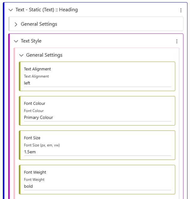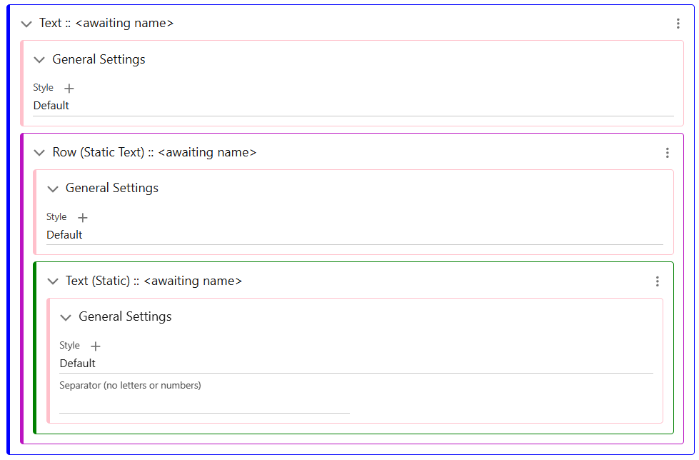 All Text in a Row can be styled by the Text Row General Settings Class, as it is cascading, but each can also be overwritten individually by adding its own style class in the Text (Static) element. Row styling can also provide padding and margins within the Text Component/Wrapper.