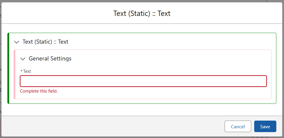 The final level, Text (Static) is where the freeform text is added. Using the ‘Edit Translation’ option in the Text (Static) menu will provide the following box, simply add your desired text here and save.