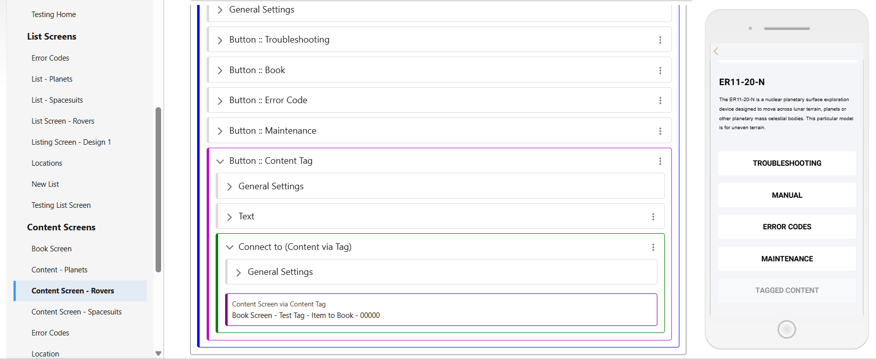 By using a Content Tag button, you can have as many endpoint resolutions as required, all from one single screen. As seen in the screenshot below, a button grid can be connected to its subsequent screen via the selected content tag.